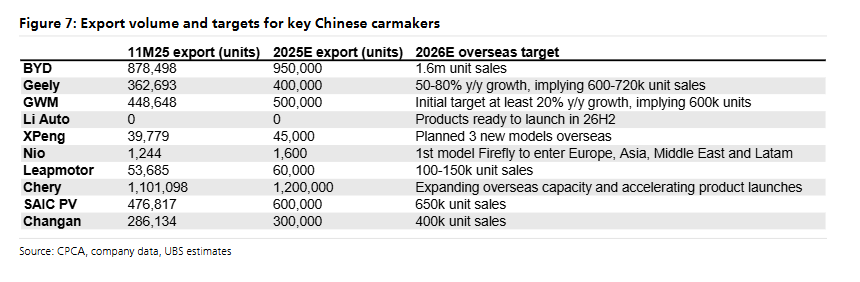 瑞银认为,随着国内市场增长放缓和需求饱和,海外扩张对2026年的增长前景至关重要。中国车企正通过建立品牌信任、发展分销渠道和加速本土化生产来应对市场波动、地方保护主义和日益激烈的竞争。