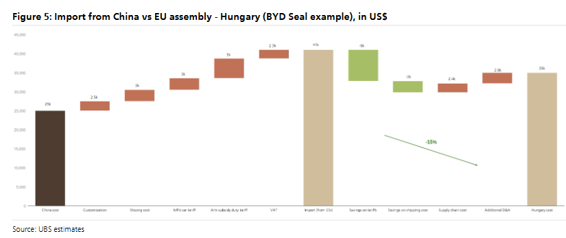 瑞银测算显示,通过本土化生产,比亚迪可以免除关税并减少运输费用。尽管考虑到欧盟当地采购和制造成本高出10%-20%,关税和物流节省的费用可能超过成本增加,从而改善利润率或提供定价灵活性。