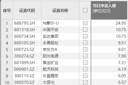 上证报中国证券网讯Choice数据显示,12月5日,资金净流入额排名前十的个股依次是N摩尔-U、中国平安、实达集团、永鼎股份、京东方A、阳光电源、紫金矿业、航天科技、长盈精密、太辰光。其中,摩尔线程上市首日获净流入24.95亿元,居所有个股首位。