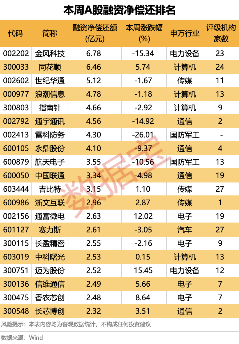 85股融资净偿还额超过1亿元。金风科技同花顺世纪华通排名前三,融资净偿还额依次为6.78亿元、6.46亿元、5.12亿元;浪潮信息指南针通宇通讯雷科防务永鼎股份等融资净偿还均在4亿元以上。