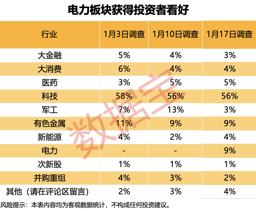 从板块来看,科技板块看好率维持高位,56%的受访者表示看好。受消息面“‘十五五’时期,国家电网公司固定资产投资预计达到4万亿元”的提振,新增加的“电力”板块获得投资者青睐,占比达9%。
