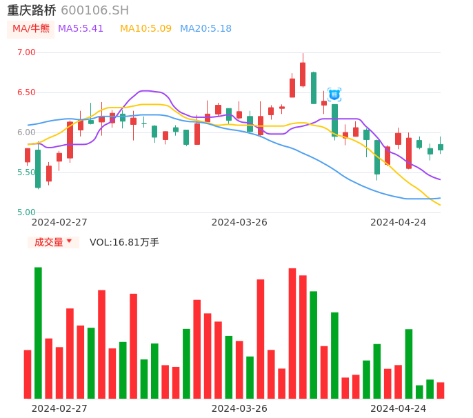 04月24日,重庆路桥收报5.78,股价涨幅0.87%,成交金额9770.30万元,换手率1.27%。