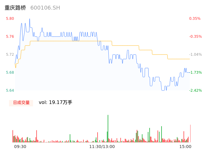 04月25日,重庆路桥收报5.68,股价涨幅-1.73%,成交金额1.09亿元,换手率1.44%。