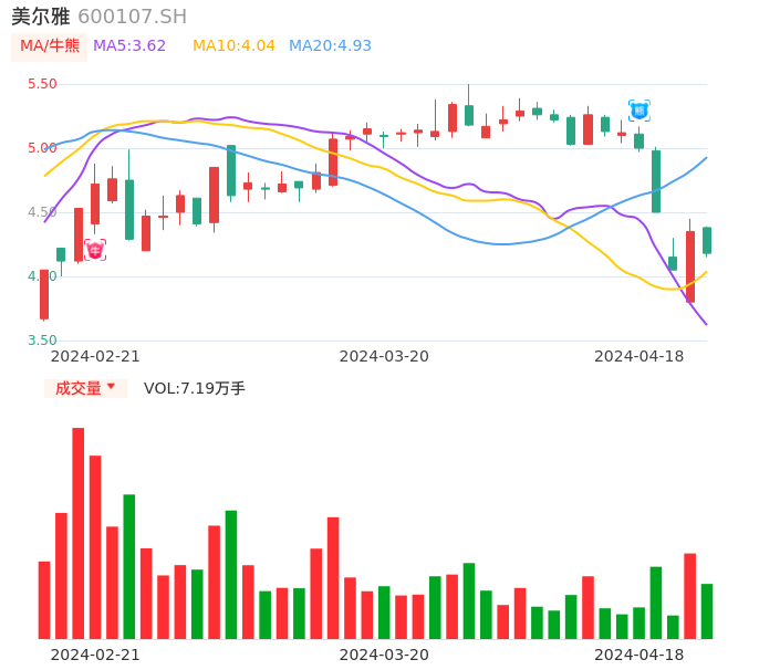 04月18日,美尔雅收报4.18,股价涨幅-3.91%,成交金额3030.67万元,换手率2.00%。