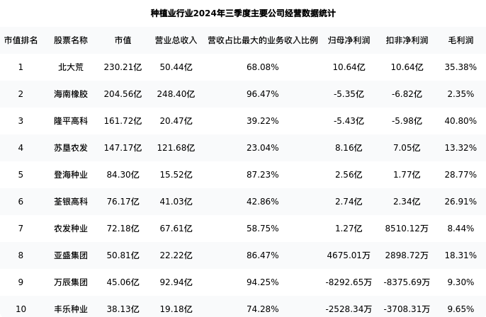 亚盛集团最新报告期数据为三季度,下表汇总了种植业行业内市值靠前的公司三季度主要经营数据