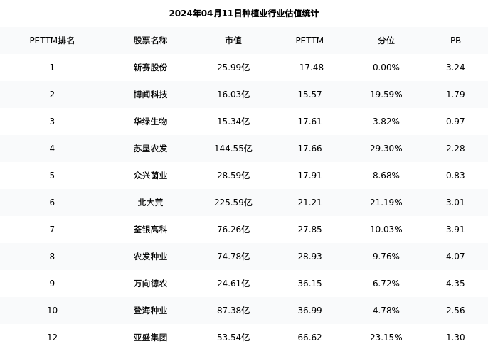 从估值角度看:亚盛集团最新市盈率PETTM为66.62,在行业内排名11/20,处于23.15分位。