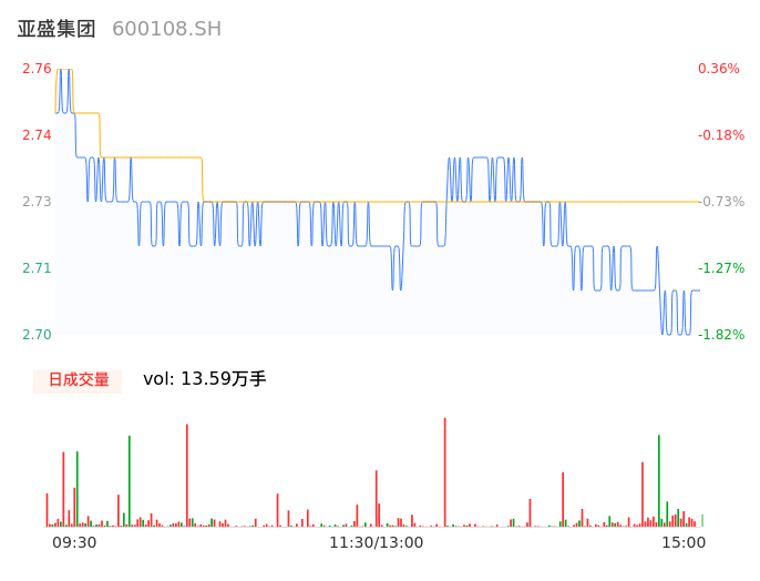 04月12日,亚盛集团收报2.70,股价涨幅-1.82%,成交金额3703.84万元,换手率0.70%。