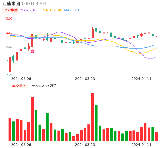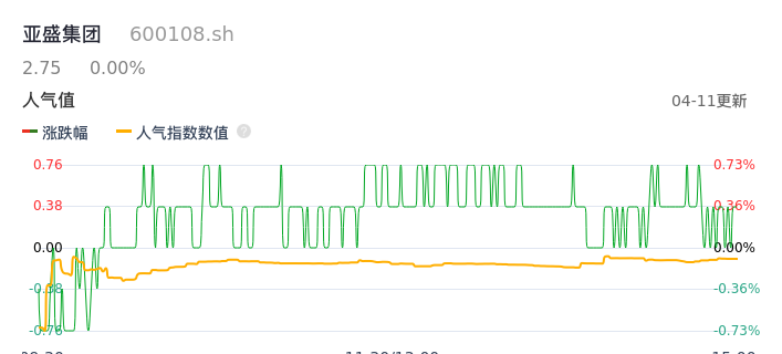 04月11日,亚盛集团收报2.75,股价涨幅0.00%,成交金额3465.31万元,换手率0.65%。