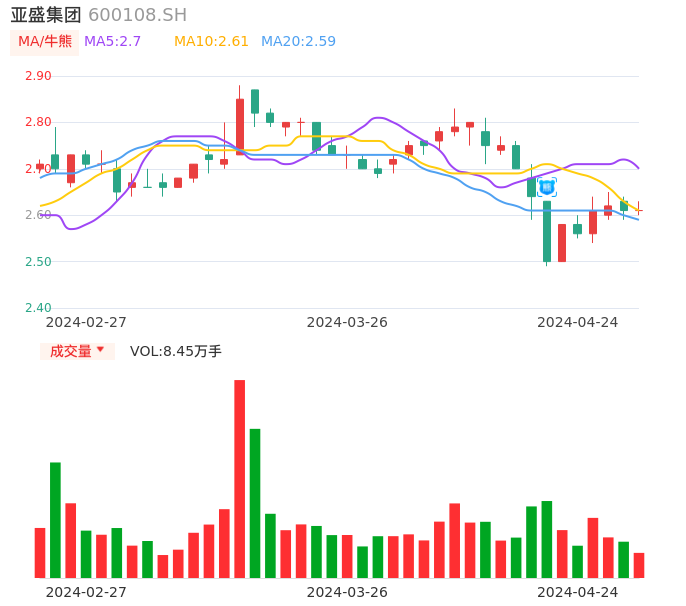 04月24日,亚盛集团收报2.61,股价涨幅0.00%,成交金额2207.61万元,换手率0.43%。