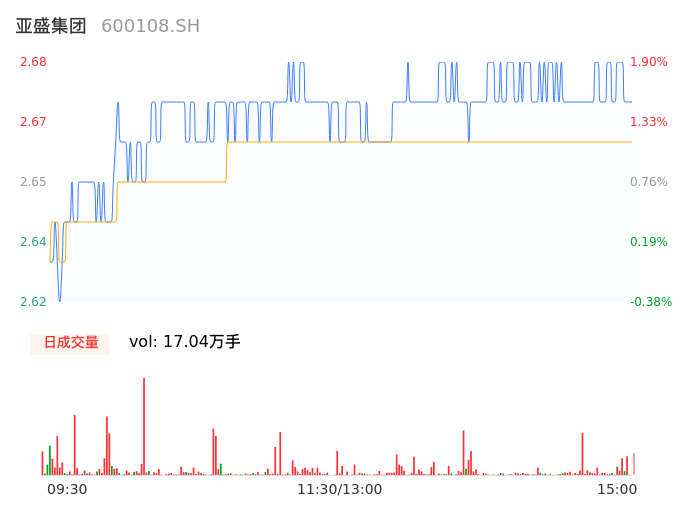 04月29日,亚盛集团收报2.68,股价涨幅1.90%,成交金额4536.43万元,换手率0.88%。