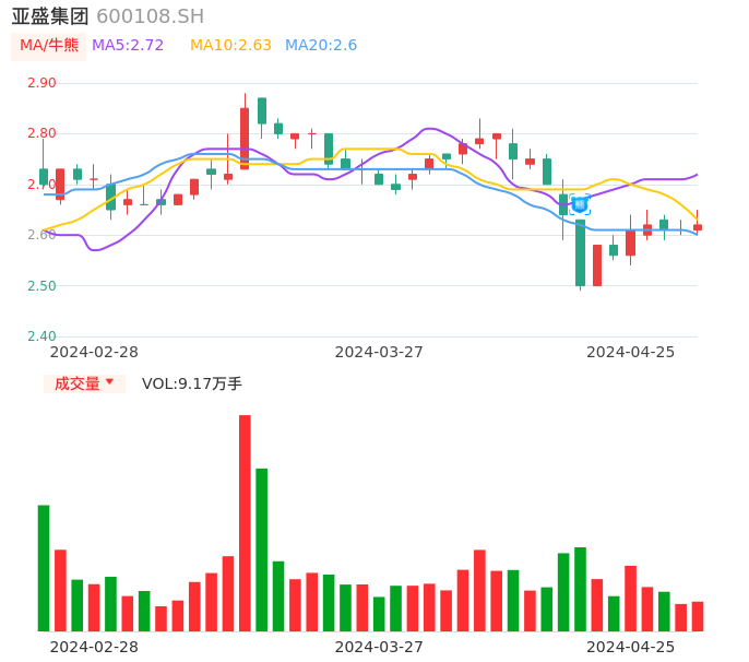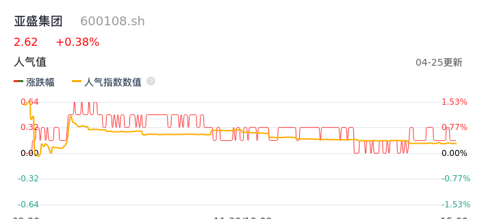 04月25日,亚盛集团收报2.62,股价涨幅0.38%,成交金额2408.61万元,换手率0.47%。