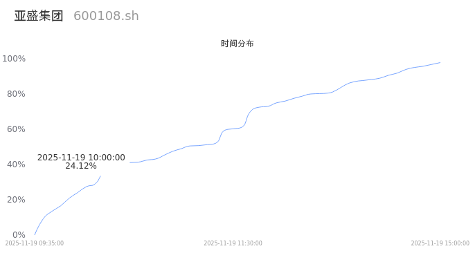 600108亚盛集团2025年11月19日成交42.68万手,成交金额1.37亿,相较昨日缩量10.57万手,换手率2.19%,成交清淡。