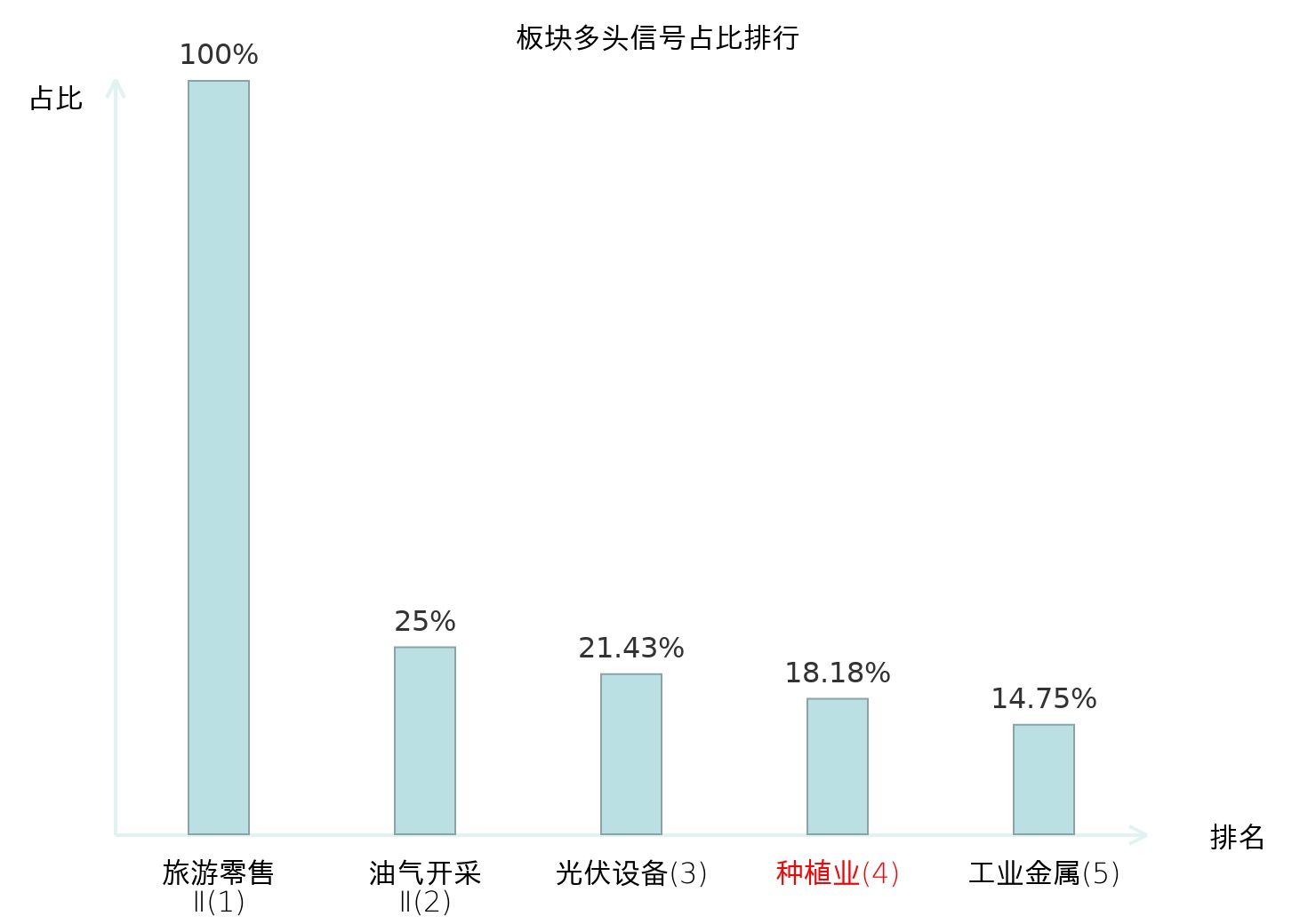 全市场所有行业板块中主力多头信号占比排名中,旅游零售Ⅱ板块位居第一。旅游零售Ⅱ板块名次提升最快,较昨日上升130位。