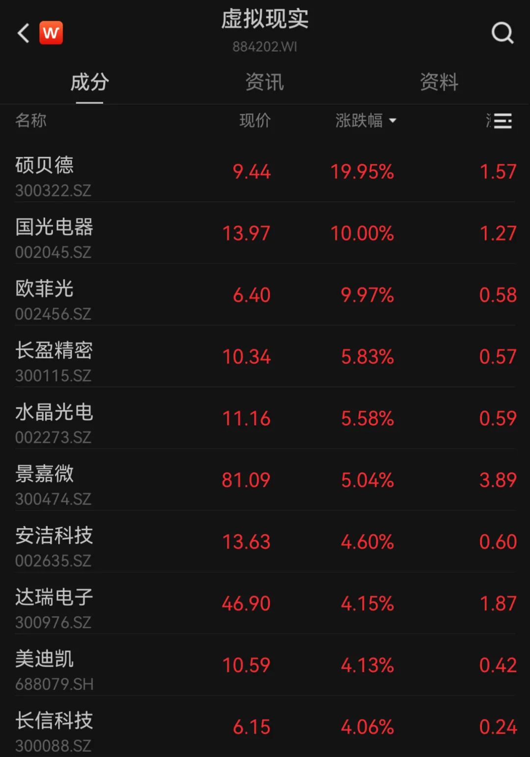 9月28日,混合现实概念拉升,硕贝德20CM涨停,国光电器、欧菲光涨停,长盈精密、水晶光电等跟涨。