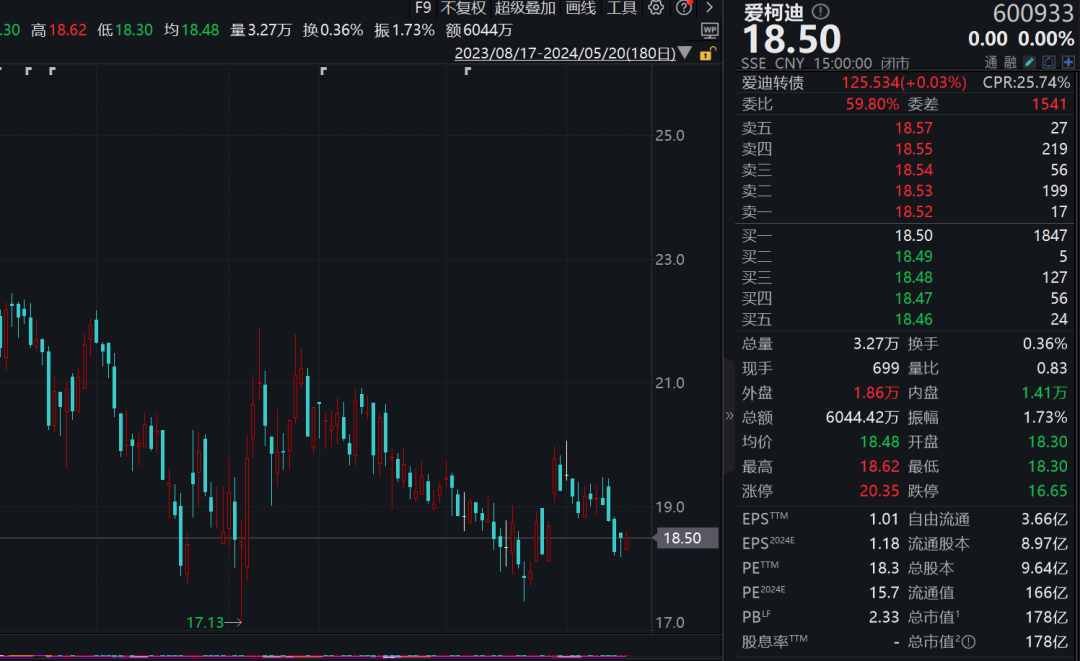 5月20日,爱柯迪收于18.5元/股,总市值为178亿元。
