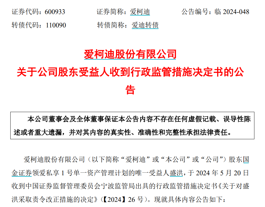 行政监管措施决定书显示,国金证券领爱私享1号单一资产管理计划作为爱柯迪持股5%以上股东的一致行动人,于2023年7月24 日至2023 年7 月26 日通过集中竞价交易方式减持爱柯迪股份316.9万股,占爱柯迪当时总股本的 0.3537%。
