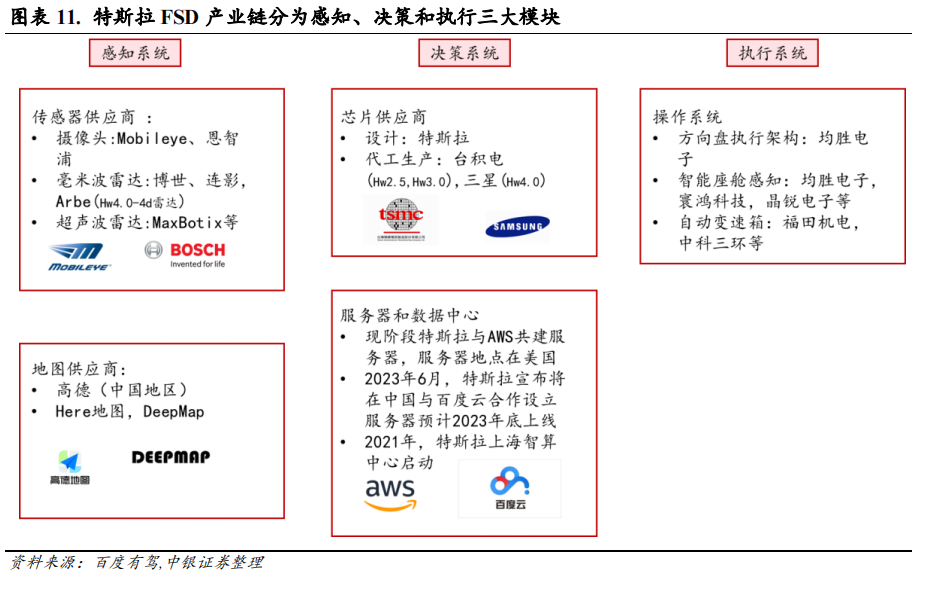 特斯拉FSD产业链主要涉及芯片、服务器和数据中心、传感器、高清地图以及自动驾驶操作系统。