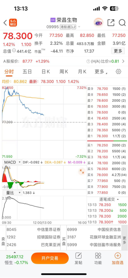 上证报中国证券网讯12月11日,荣昌生物盘中一度涨超7%,最高价报82.85港元/股。截至13时13分,该股涨幅回落至1.42%,报78.3港元/股。