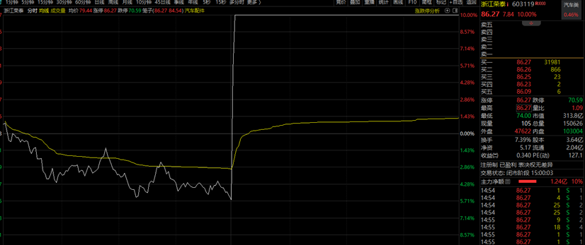 浙江荣泰今天小幅高开后震荡走低,上午收盘跌超5%,午后开盘后直线飙升,短短1分钟时间拉升至涨停,并维持到收盘。