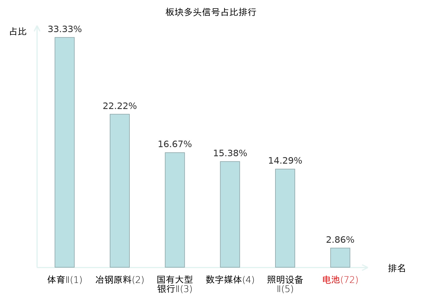 全市场所有行业板块中主力多头信号占比排名中,体育Ⅱ板块位居第一。体育Ⅱ板块名次提升最快,较昨日上升129位。