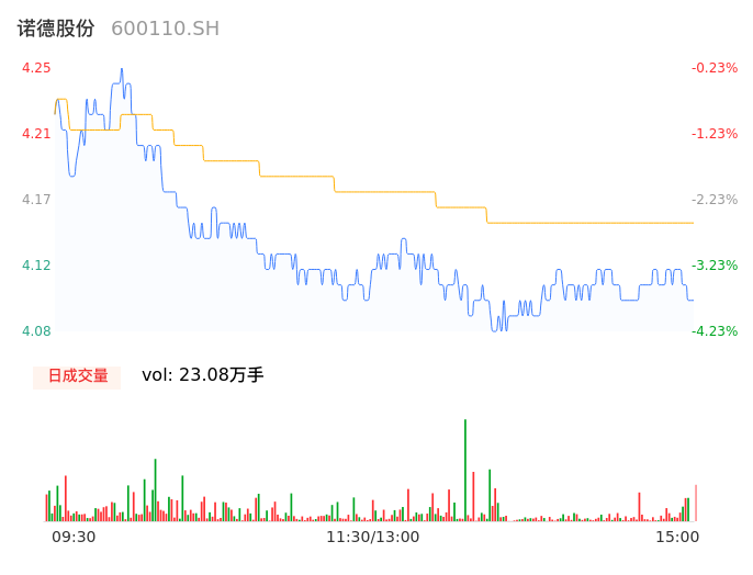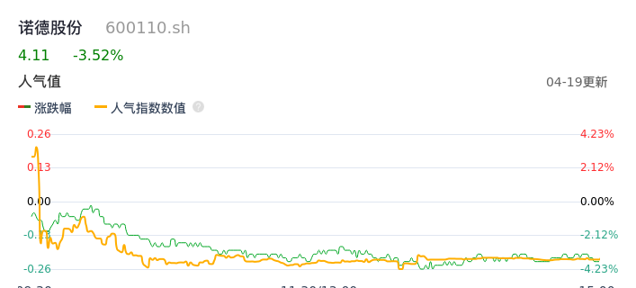 04月19日,诺德股份收报4.11,股价涨幅-3.52%,成交金额9564.15万元,换手率1.32%。