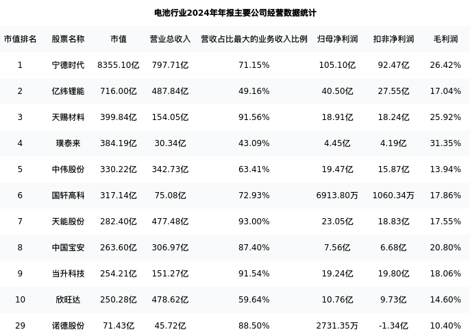 诺德股份最新报告期数据为年报,下表汇总了电池行业内市值靠前的公司年报主要经营数据