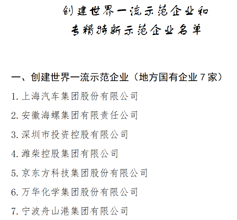 据国资委网站,本次入选创建世界一流示范企业的均为地方国企,分别是上汽集团、安徽海螺集团、深圳市投资控股集团、淮柴控股集团、京东方科技集团、万华化学集团、宁波舟山港集团。