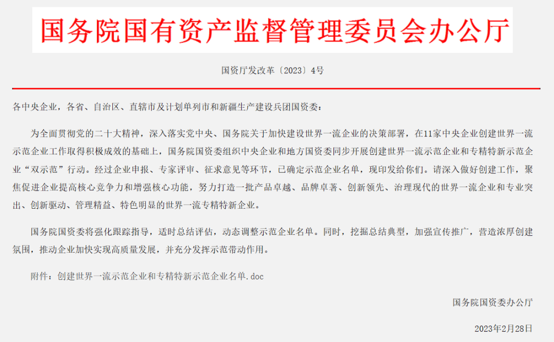 3月16日,国资委在其官网正式发布《关于印发创建世界一流示范企业和专精特新示范企业名单的通知》。