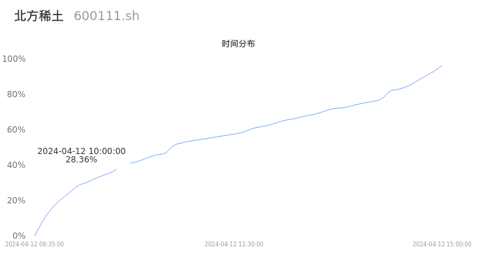 600111北方稀土2024年04月12日成交34.49万手,成交金额7.00亿元,相较昨日缩量11.48万手,换手率0.95%,成交清淡。