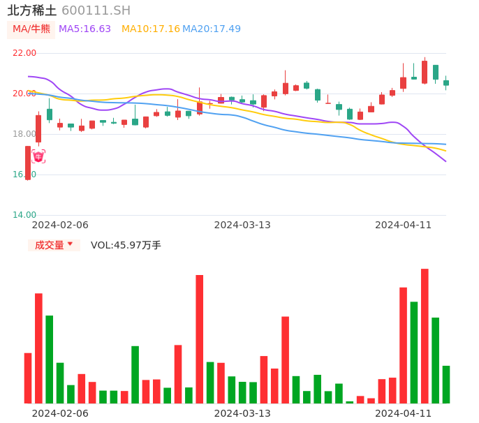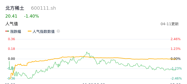 04月11日,北方稀土收报20.41,股价涨幅-1.40%,成交金额9.41亿元,换手率1.27%。