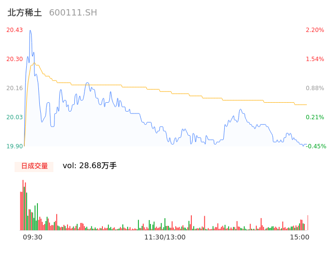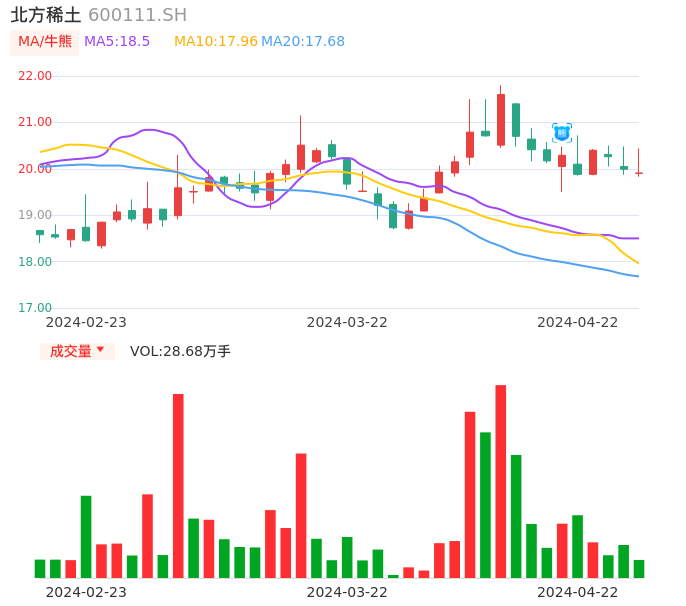 04月22日,北方稀土收报19.91,股价涨幅-0.40%,成交金额5.76亿元,换手率0.79%。