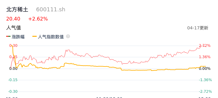 04月17日,北方稀土收报20.40,股价涨幅2.62%,成交金额7.49亿元,换手率1.03%。