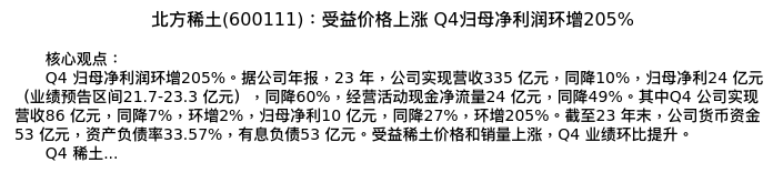 值得注意的是:2024年04月广发证券的分析师,首次发布关于北方稀土的研究报告,标题为:北方稀土(600111):受益价格上涨 Q4归母净利润环增205%。