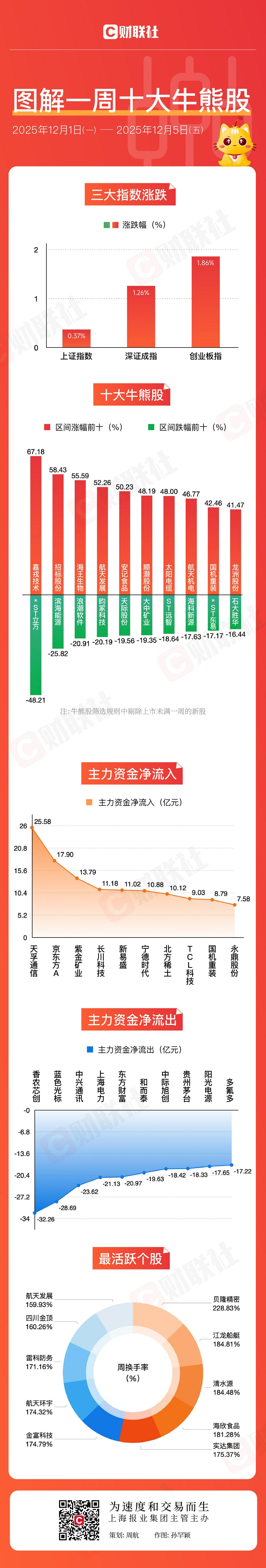 财联社12月7日讯,本周A股三大指数反弹拉升,其中上证指数周涨0.37%,深成指周涨1.26%,创业板指周涨1.86%。本周工业金属、医药商业、保险板块涨幅居前,福建、商业航天概念股表现活跃。