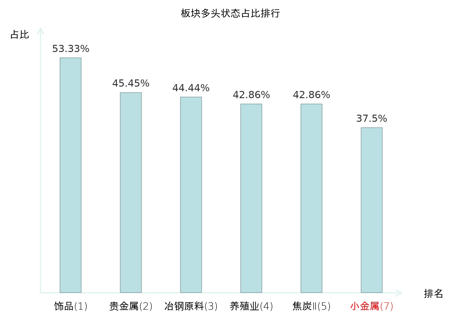 全市场所有行业板块中主力多头状态占比排名中,饰品板块位居第一。非金属材料Ⅱ板块名次提升最快,较昨日上升58位。