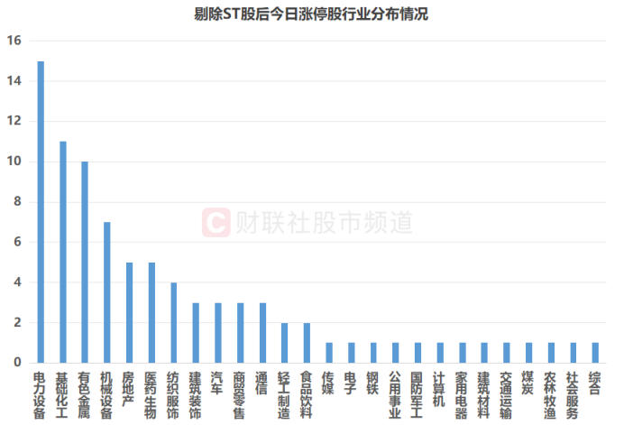 按行业板块(申万一级)来统计,今日录得涨停的个股中,剔除ST股外,来自电力设备、基础化工、有色金属板块的比例较高,占比分别达17.4%、12.8%、11.6%。同时,机械设备、房地产、医药生物、纺织服饰、建筑装饰、汽车、商贸零售、通信股也相对较多。而在涨停的ST股中,建筑装饰板块标的数量最多,占今日涨停ST股近一半比例。