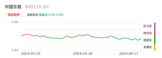 我们来看一下该股的九方特色指标强弱趋势的情况:中国东航自04月02日从持仓区下穿到观望区。股价近期持续下跌后,短期出现止跌迹象。后续重点关注能否再次站上多空分界点:3.59元。如未能有效突破则可能进入新一轮空头行情。