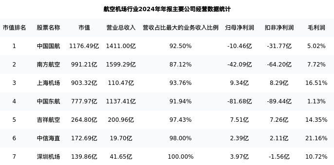中国东航最新报告期数据为年报,下表汇总了航空机场行业内市值靠前的公司年报主要经营数据