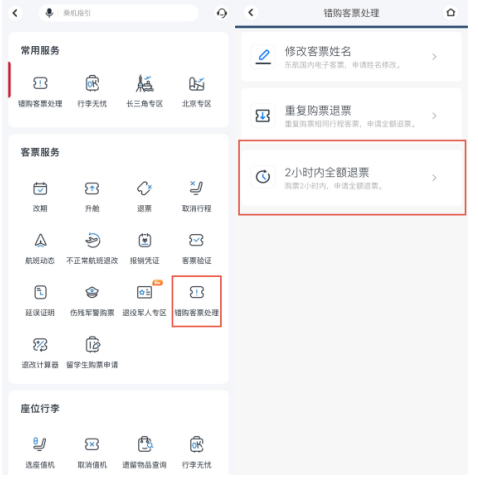 若旅客购错票、行程突发改变怎么办,东航专属的“2小时全额免费退”便民功能,为购票旅客提供灵活的退改解决方案。同一旅客180天内可合并使用“2小时全额免费退”和“2小时全额免费退登记”两次权益,该功能适用于中国大陆以人民币结算、781开头票号的东航国内、港澳台地区、国际客票(团队折扣、已使用/变更/退票等客票除外)。旅客只需在购票后2小时内且航班计划起飞前12小时之前操作,官网或App购票可直接在线办理全额退票;其他渠道购票完成登记后可回原渠道退全款,仅部分国家规定不可退税费不予退还。