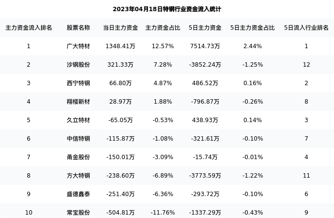 从主力资金流向来看,特钢行业今日主力资金流入2.08亿元,在所有申万二级行业中排名:117/131。