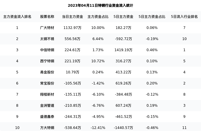 从主力资金流向来看,特钢行业今日主力资金流入2.30亿元,在所有申万二级行业中排名:109/131。