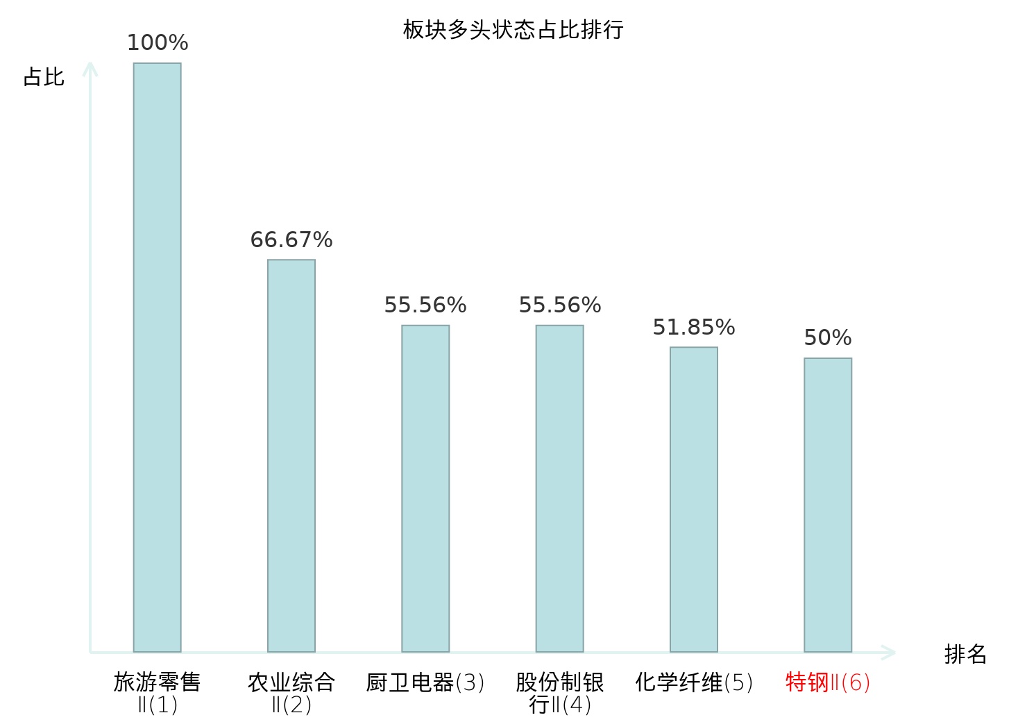全市场所有行业板块中主力多头状态占比排名中,旅游零售Ⅱ板块位居第一。国有大型银行Ⅱ板块名次提升最快,较昨日上升103位。