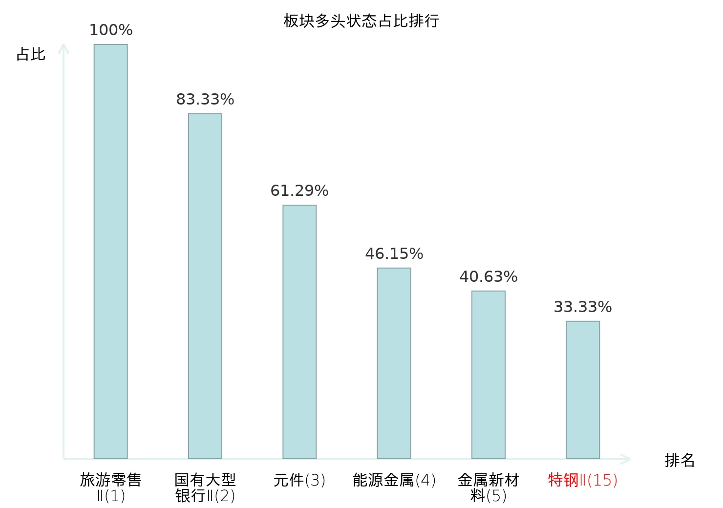 全市场所有行业板块中主力多头状态占比排名中,旅游零售Ⅱ板块位居第一。数字媒体板块名次提升最快,较昨日上升67位。