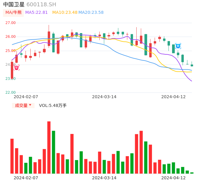 04月12日,中国卫星收报23.89,股价涨幅-0.58%,成交金额1.32亿元,换手率0.46%。