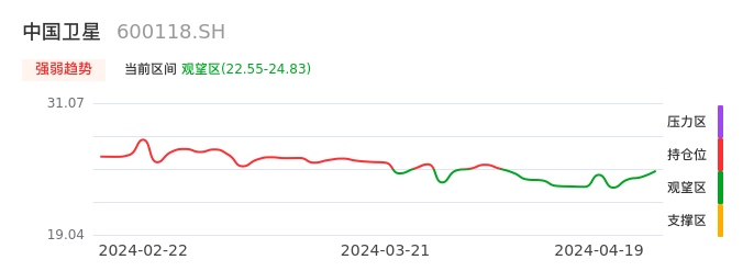 我们来看一下该股的九方特色指标强弱趋势的情况:中国卫星自04月03日从持仓区下穿到观望区。股价近期持续下跌后,短期出现止跌迹象。后续重点关注能否再次站上多空分界点:24.83元。如未能有效突破则可能进入新一轮空头行情。