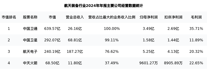 中国卫星最新报告期数据为年报,下表汇总了航天装备行业内市值靠前的公司年报主要经营数据