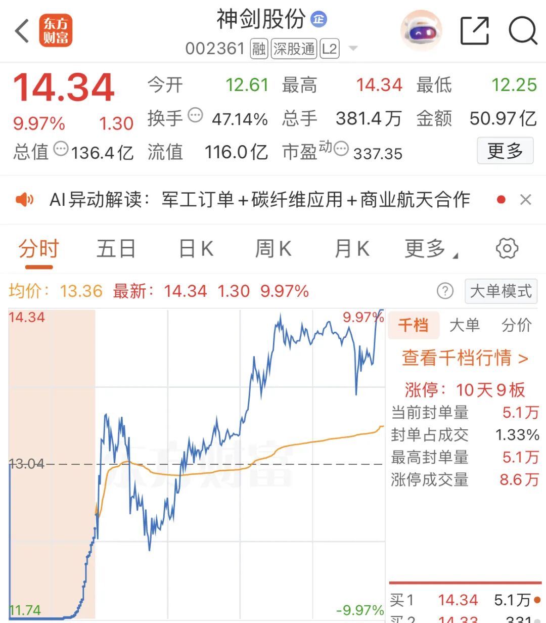 今日上午,中国卫星、烽火通信、泰尔股份、顺灏股份等10多只个股已率先涨停。午后,商业航天概念股再度走强。其中,联创光电(600363)直线拉升,股价从下跌1.7%至涨停板,用时仅1分钟。随后,板块活跃度被再度激活,中国卫通、航天电子、久之洋、中天火箭等纷纷涨停。临近尾盘时分,神剑股份也封死涨停板。