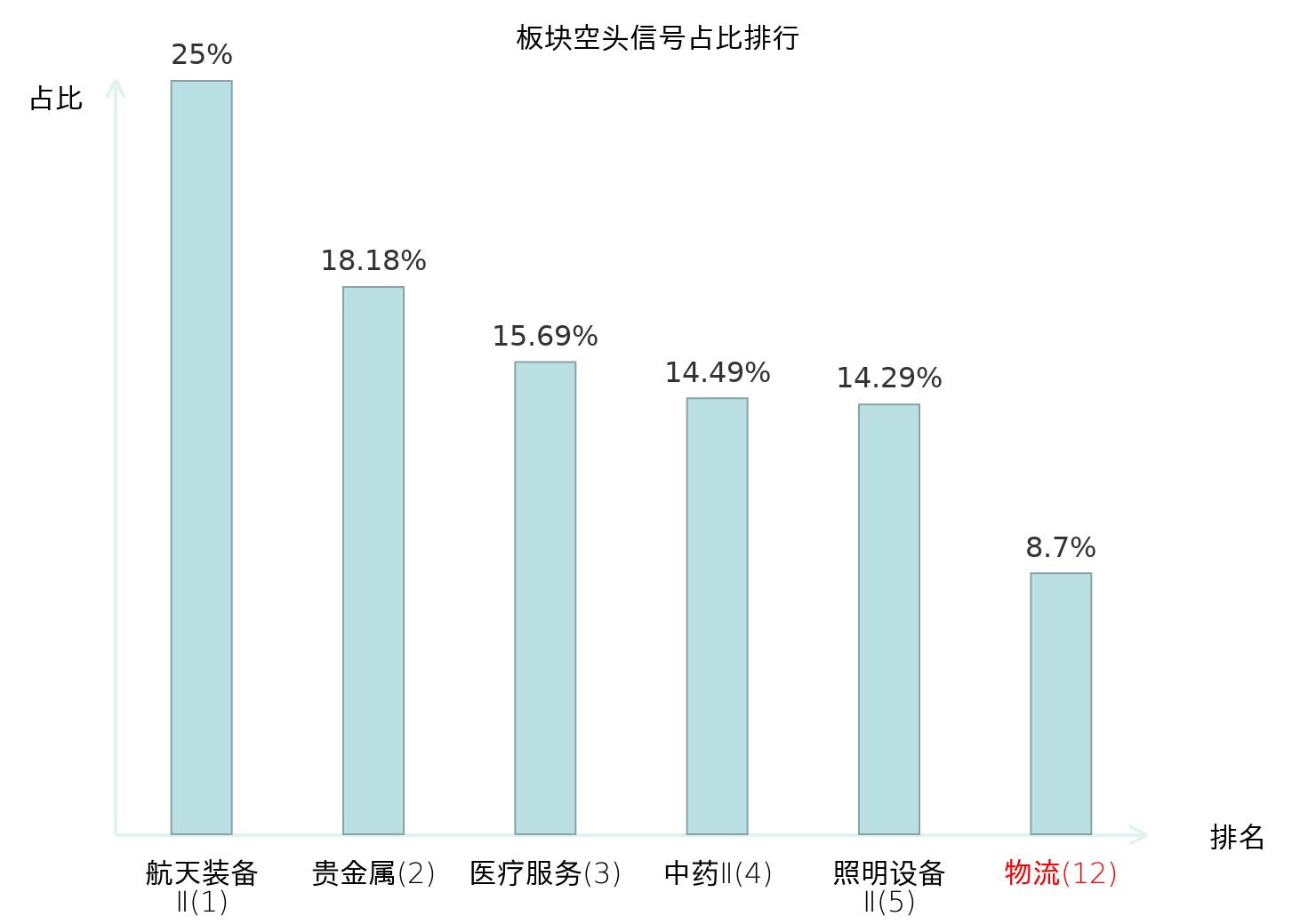 全市场所有行业板块中主力空头信号占比排名中,航天装备Ⅱ板块位居第一。物流板块名次提升最快,较昨日上升112位。