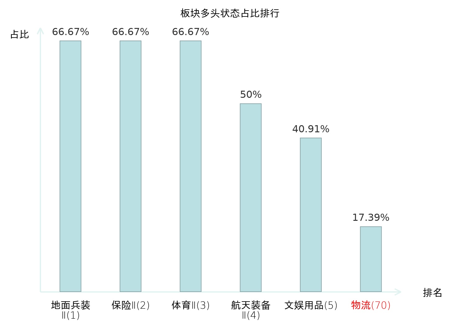 全市场所有行业板块中主力多头状态占比排名中,地面兵装Ⅱ板块位居第一。专业连锁Ⅱ板块名次提升最快,较昨日上升102位。