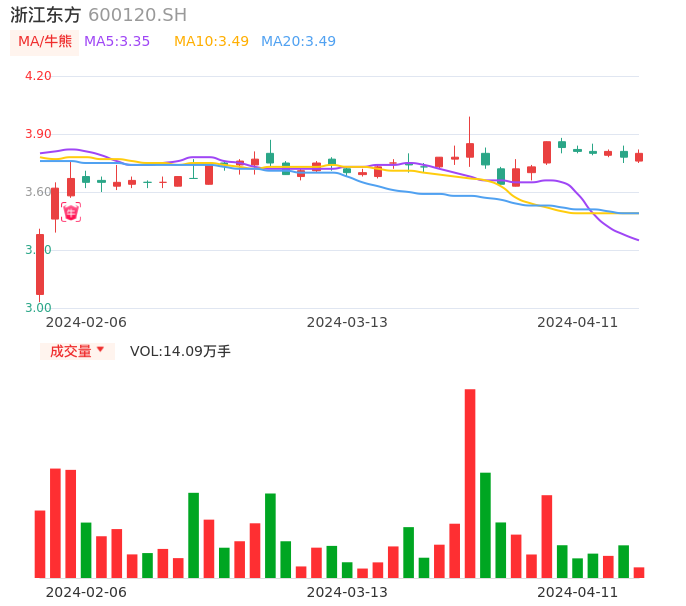 04月11日,浙江东方收报3.80,股价涨幅0.53%,成交金额5350.49万元,换手率0.41%。